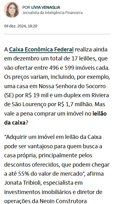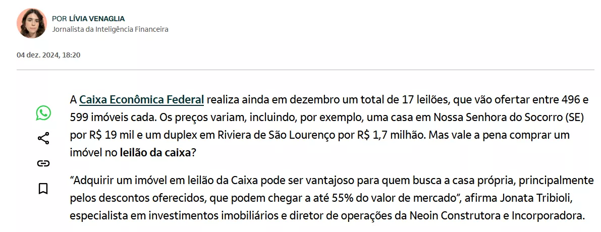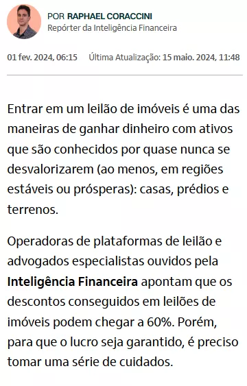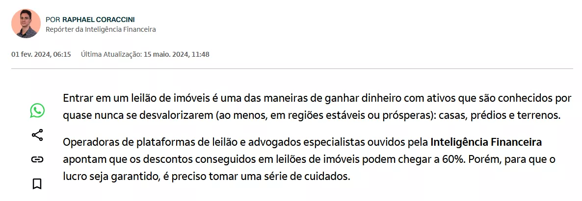 Páginas renomadas como "e | Investidor" e "Inteligência financeira" destacam grandes oportunidades atuais no mercado de leilões
